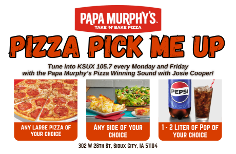 Listen every Monday and Friday for your chance to win the Papa Murphy’s Pizza Pick Me Up! We will make a winner every Monday and Friday with the Papa Murphys Pizza Winning Sound with Josie Cooper. Hear the sound and call in (712-274-1057) and win a pizza, side, and drink from Papa Murphy’s located at 302 W 28th St, Sioux City, IA 51104 in Sioux City!